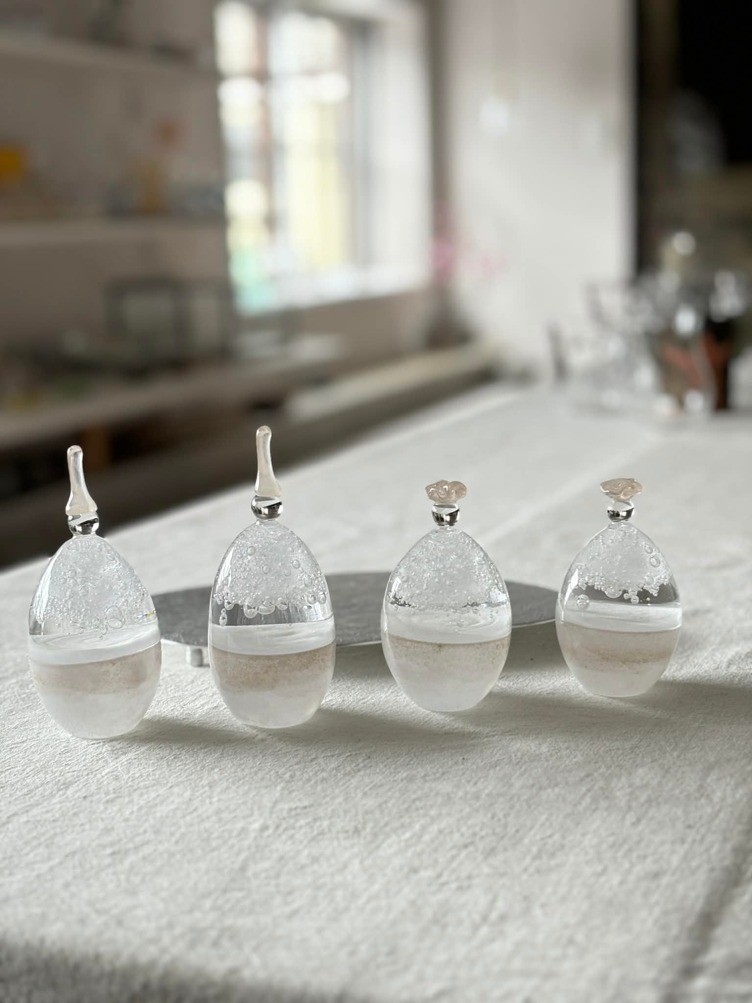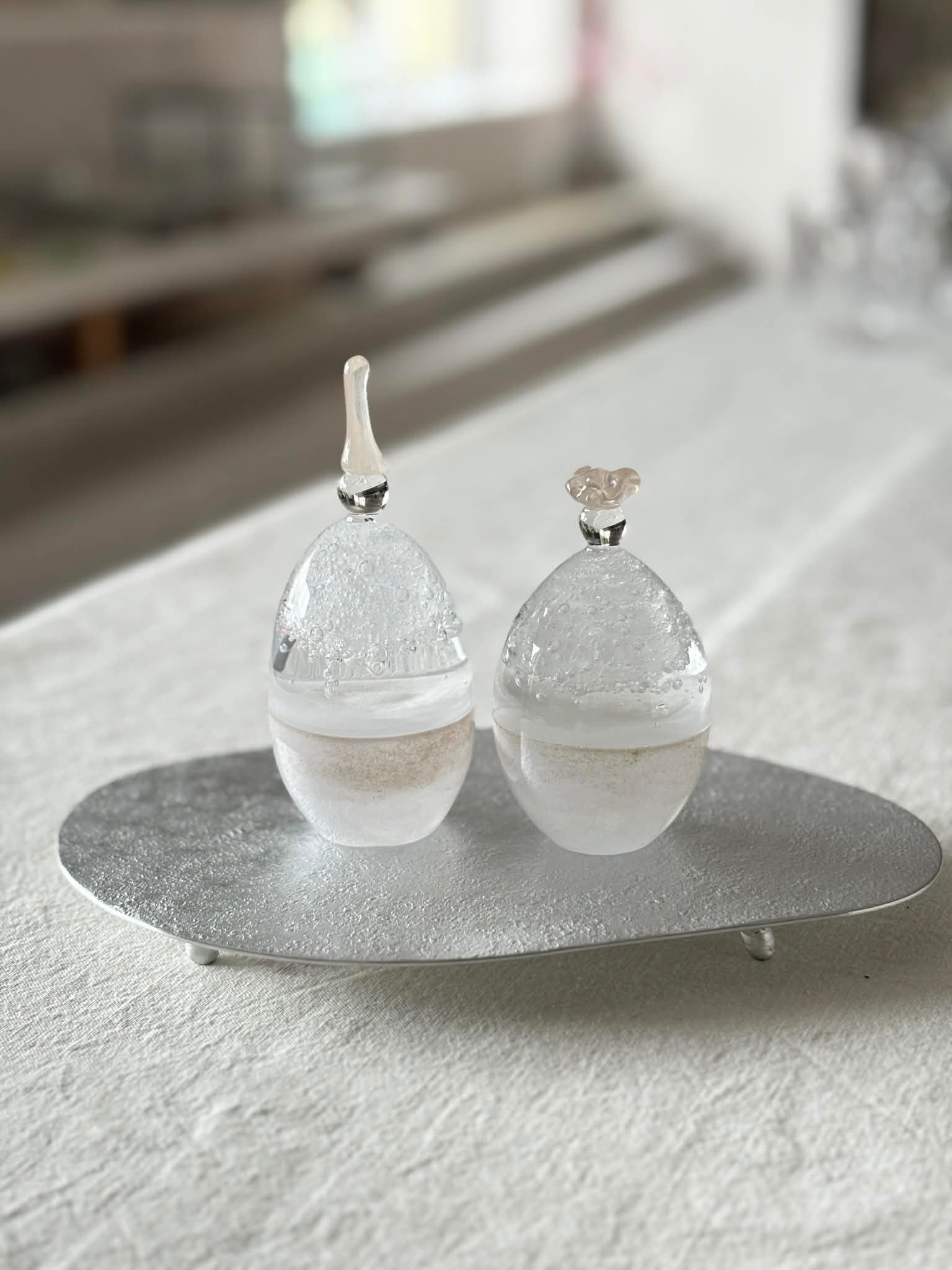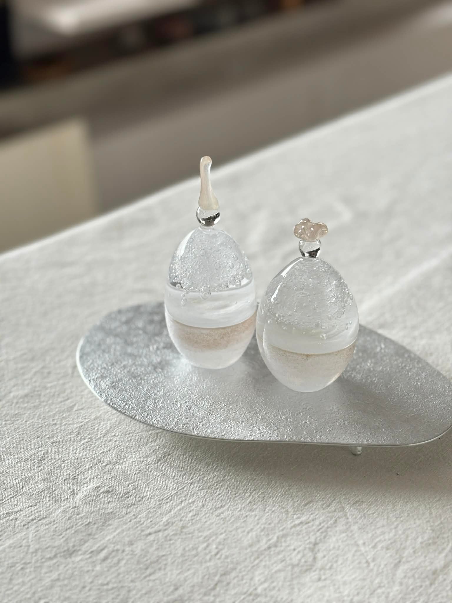 お雛様を香水瓶のような形に見立てて、すっきりとしたデザインにしています。