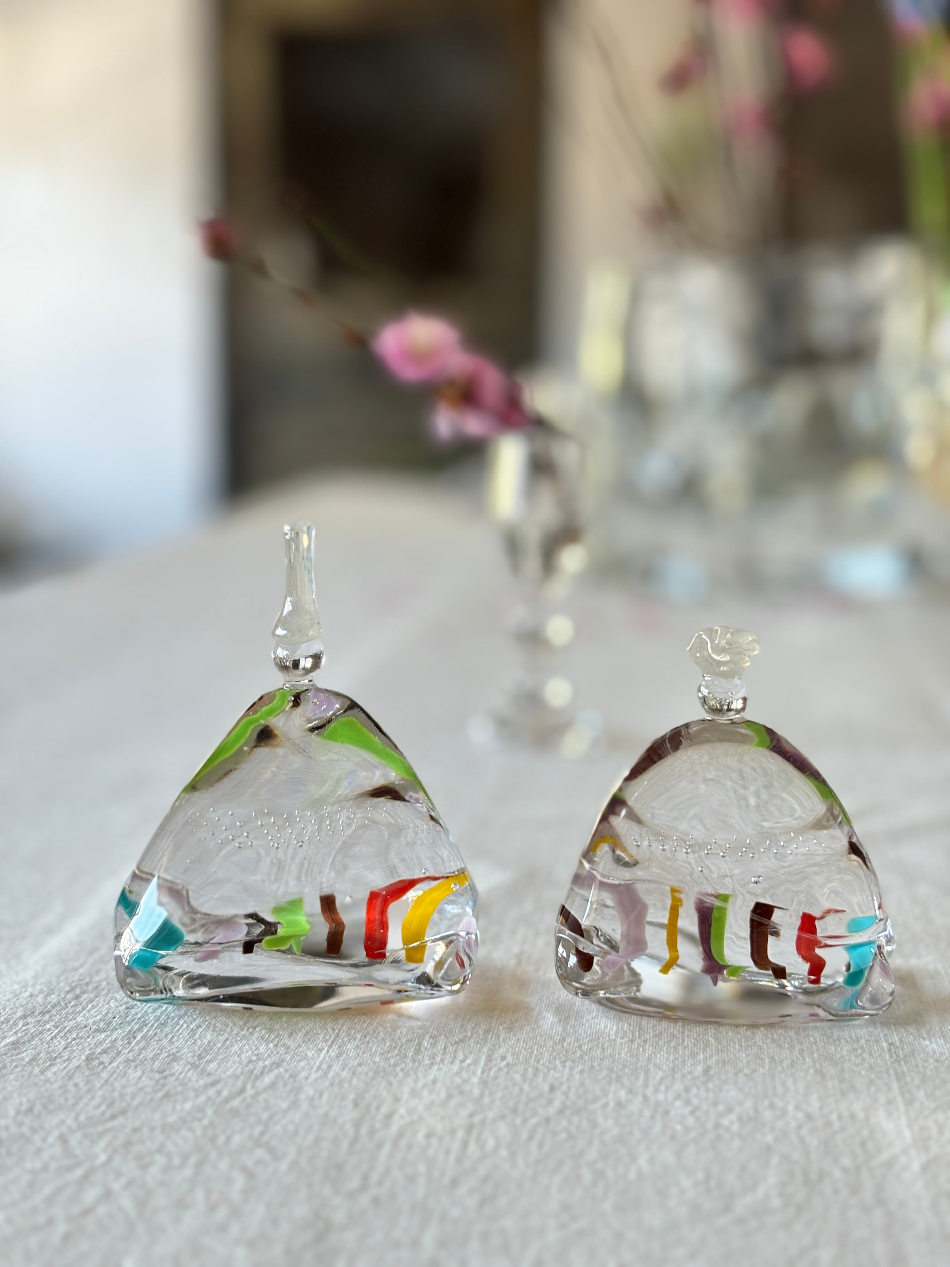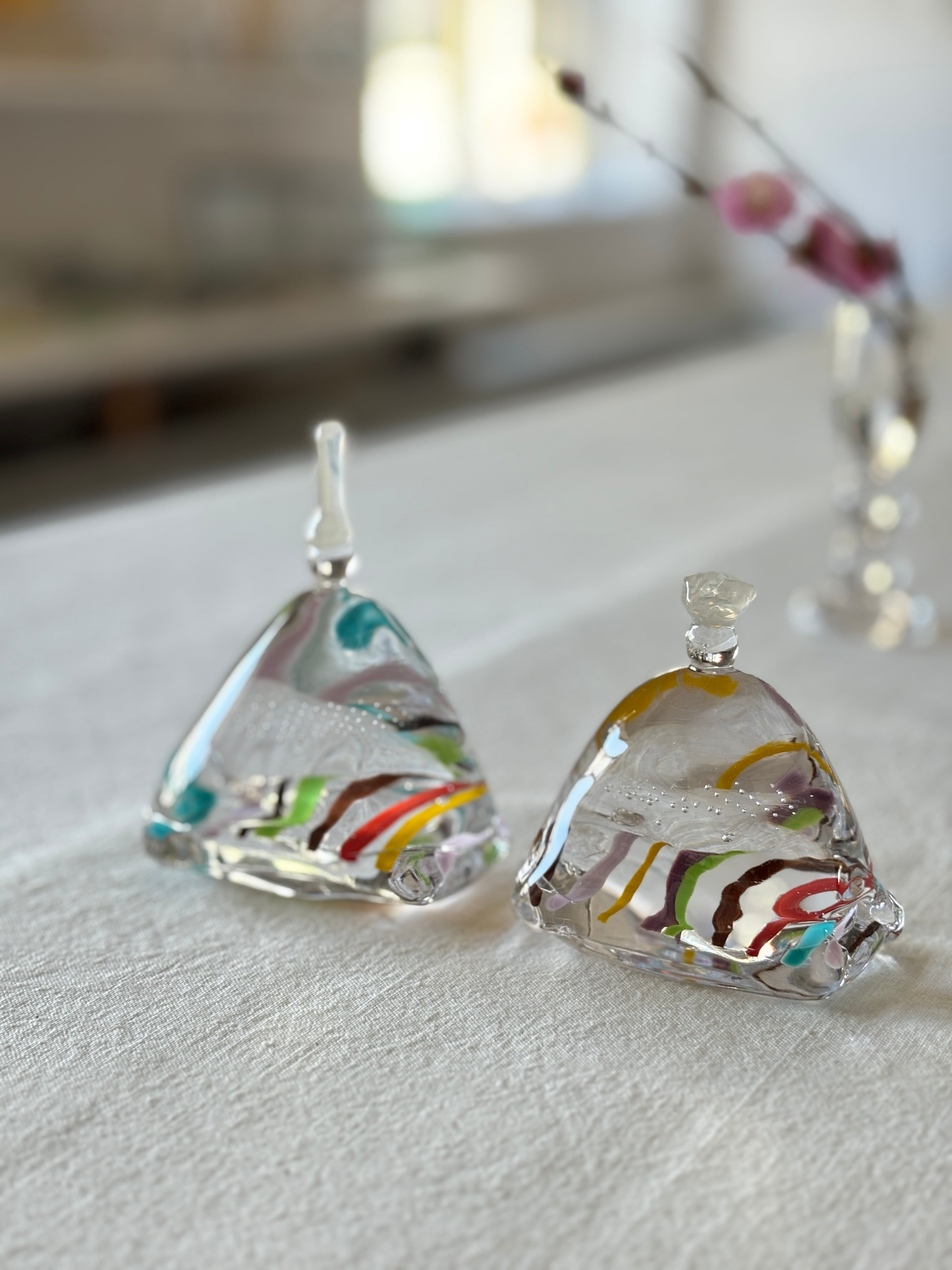 お雛様を香水瓶のような形に見立てて、すっきりとしたデザインにしています。