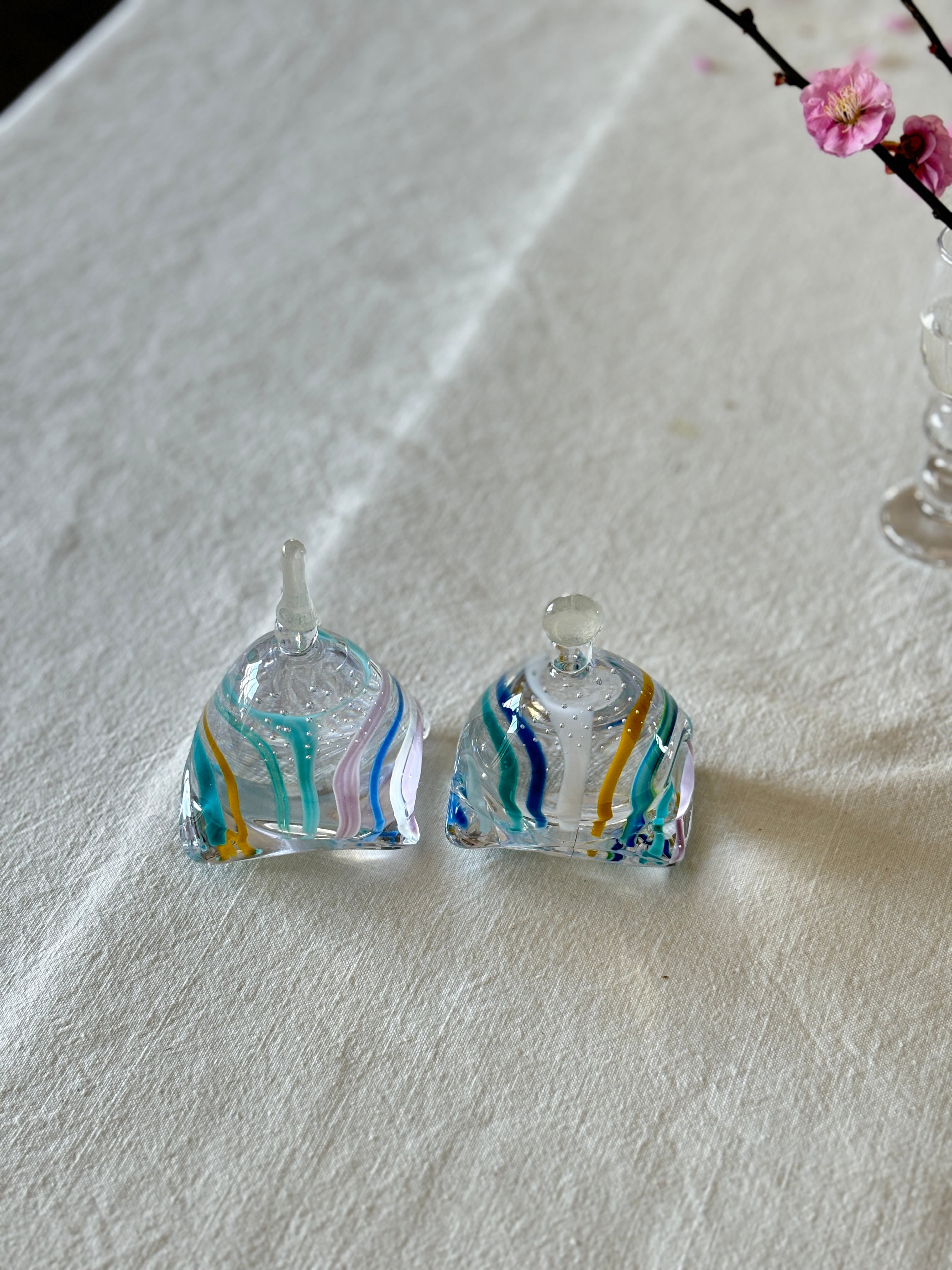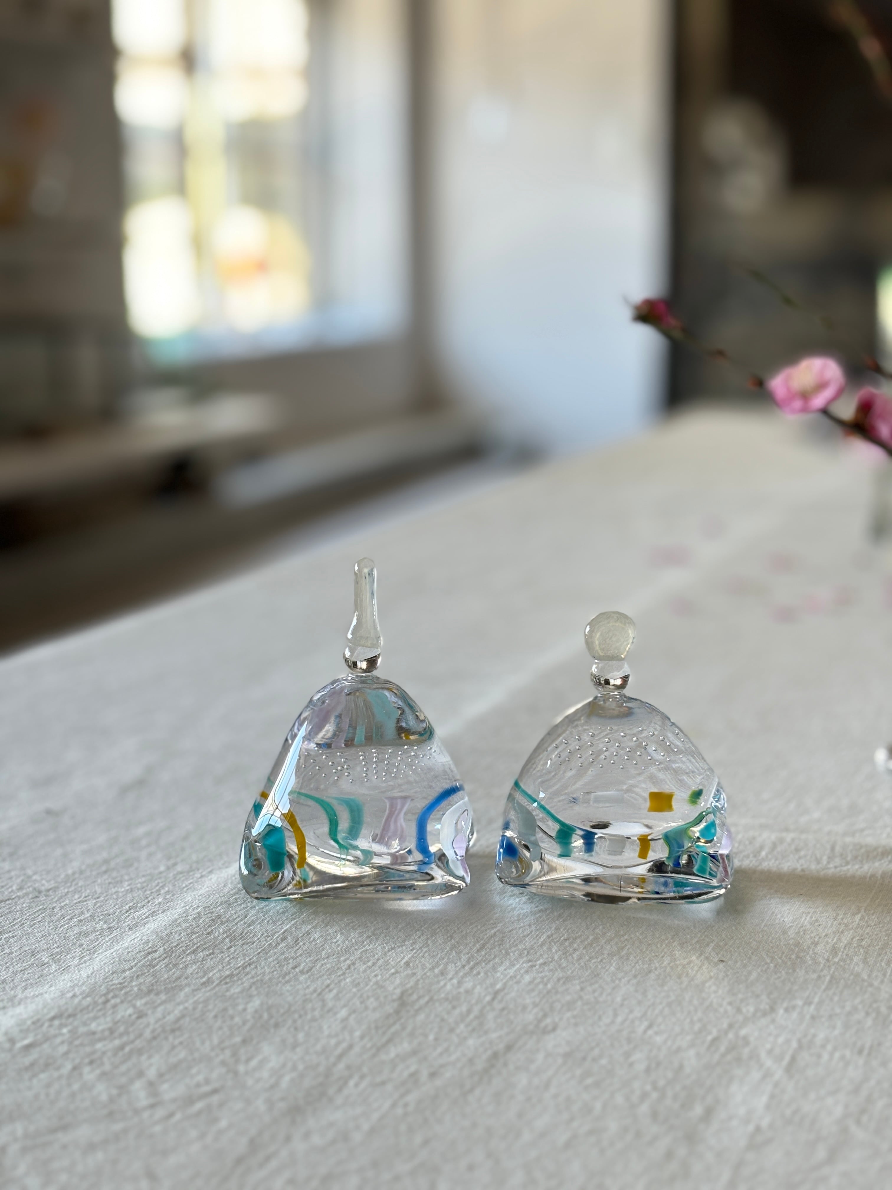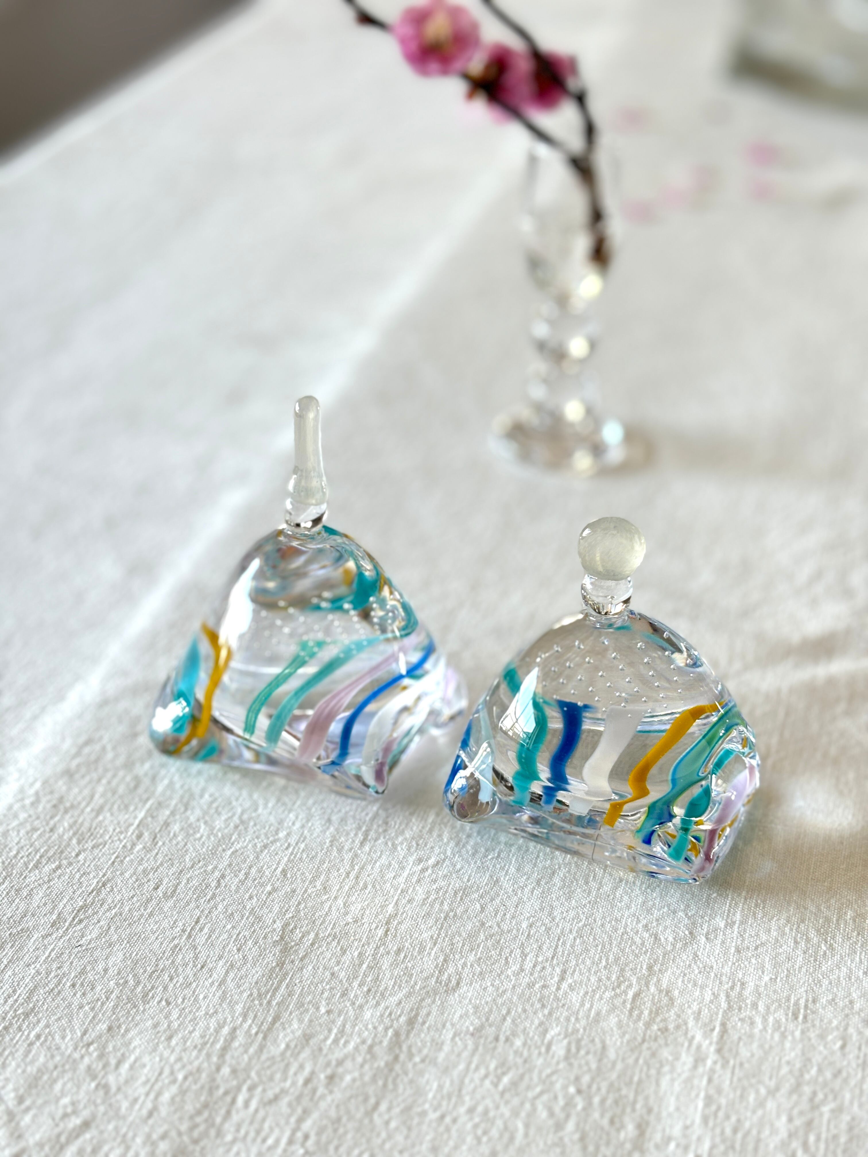 お雛様を香水瓶のような形に見立てて、すっきりとしたデザインにしています。