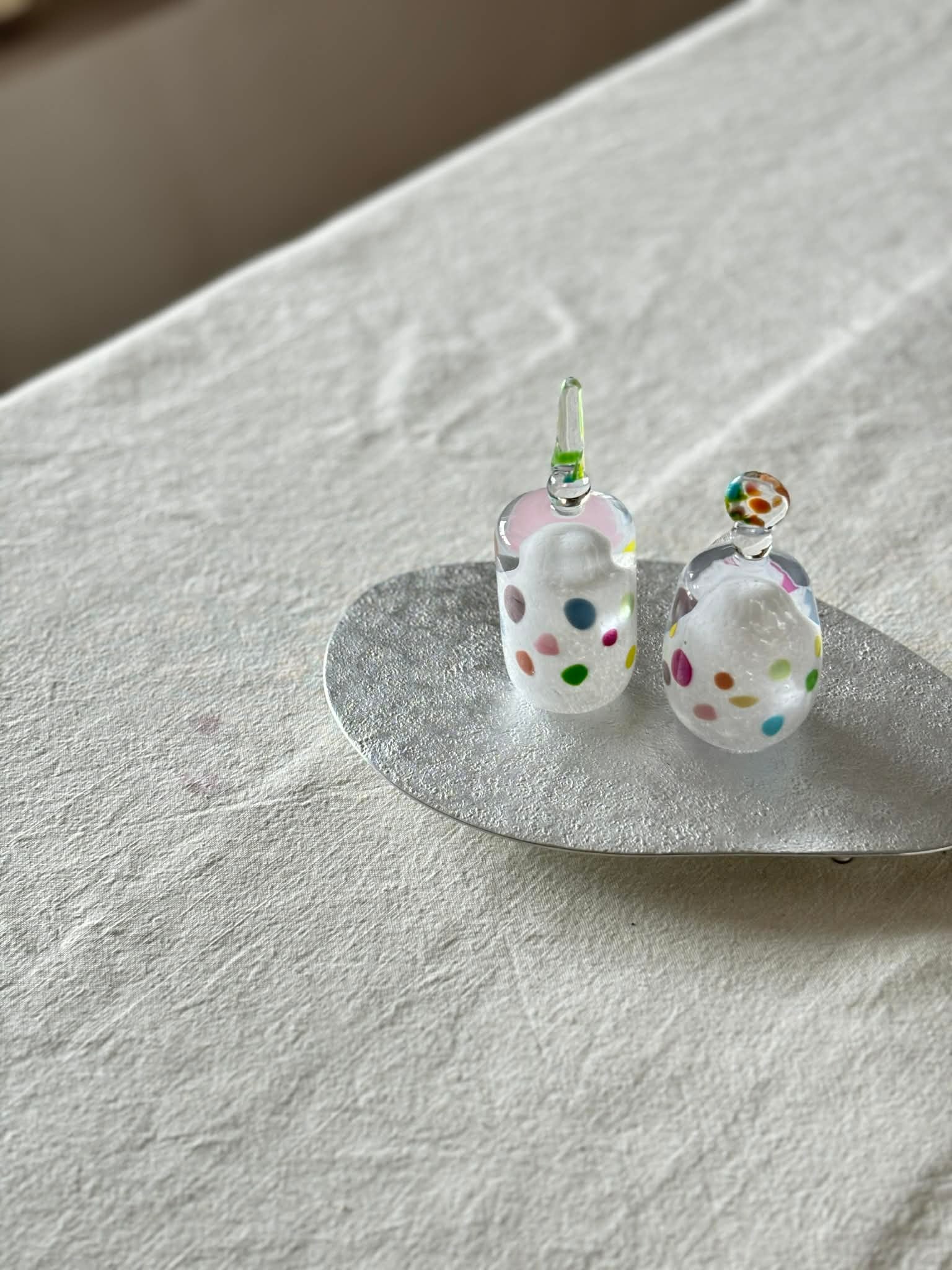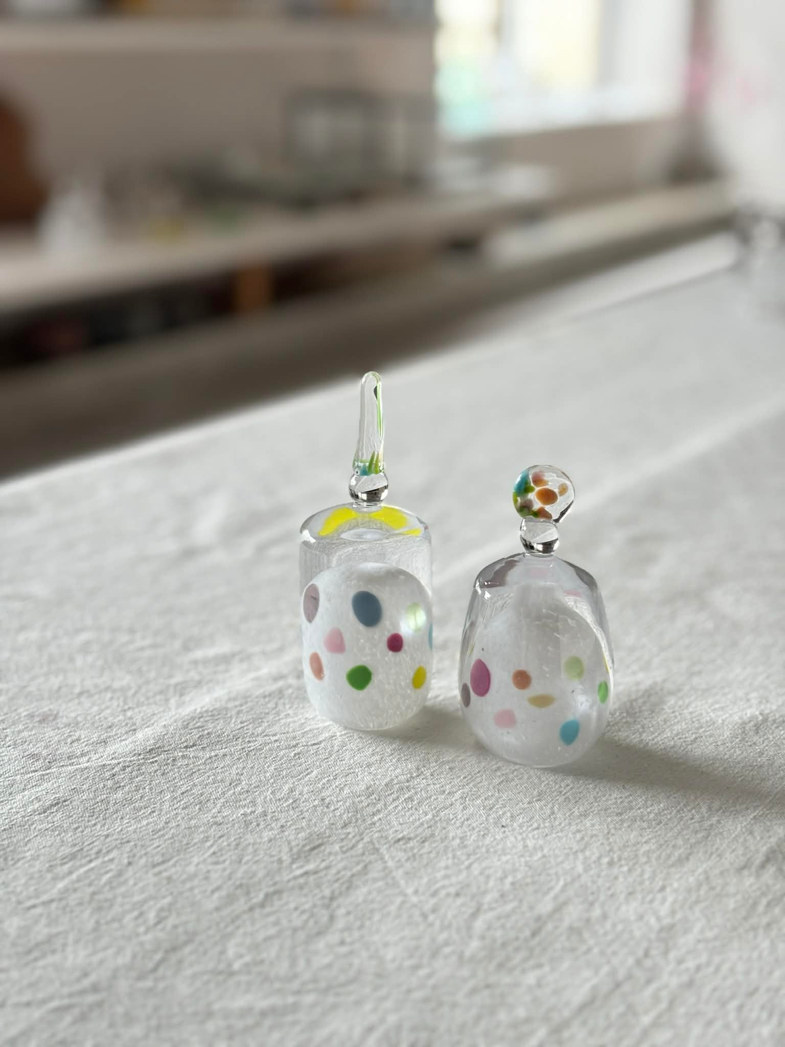 お雛様を香水瓶のような形に見立てて、すっきりとしたデザインにしています。