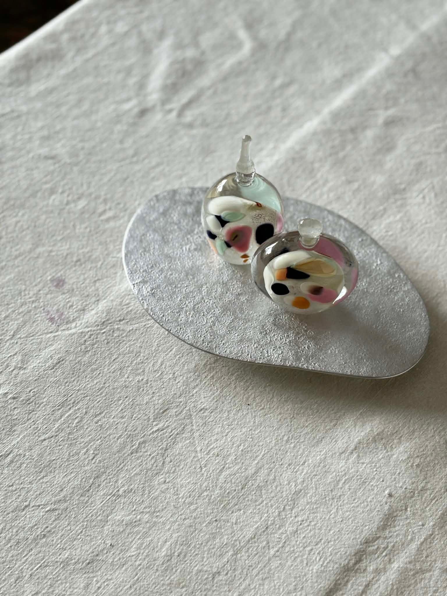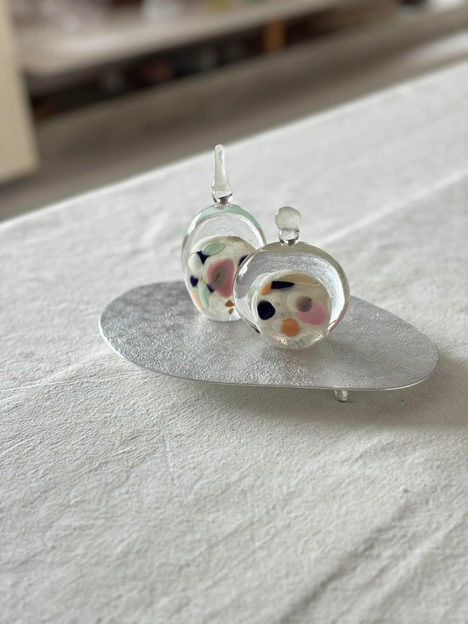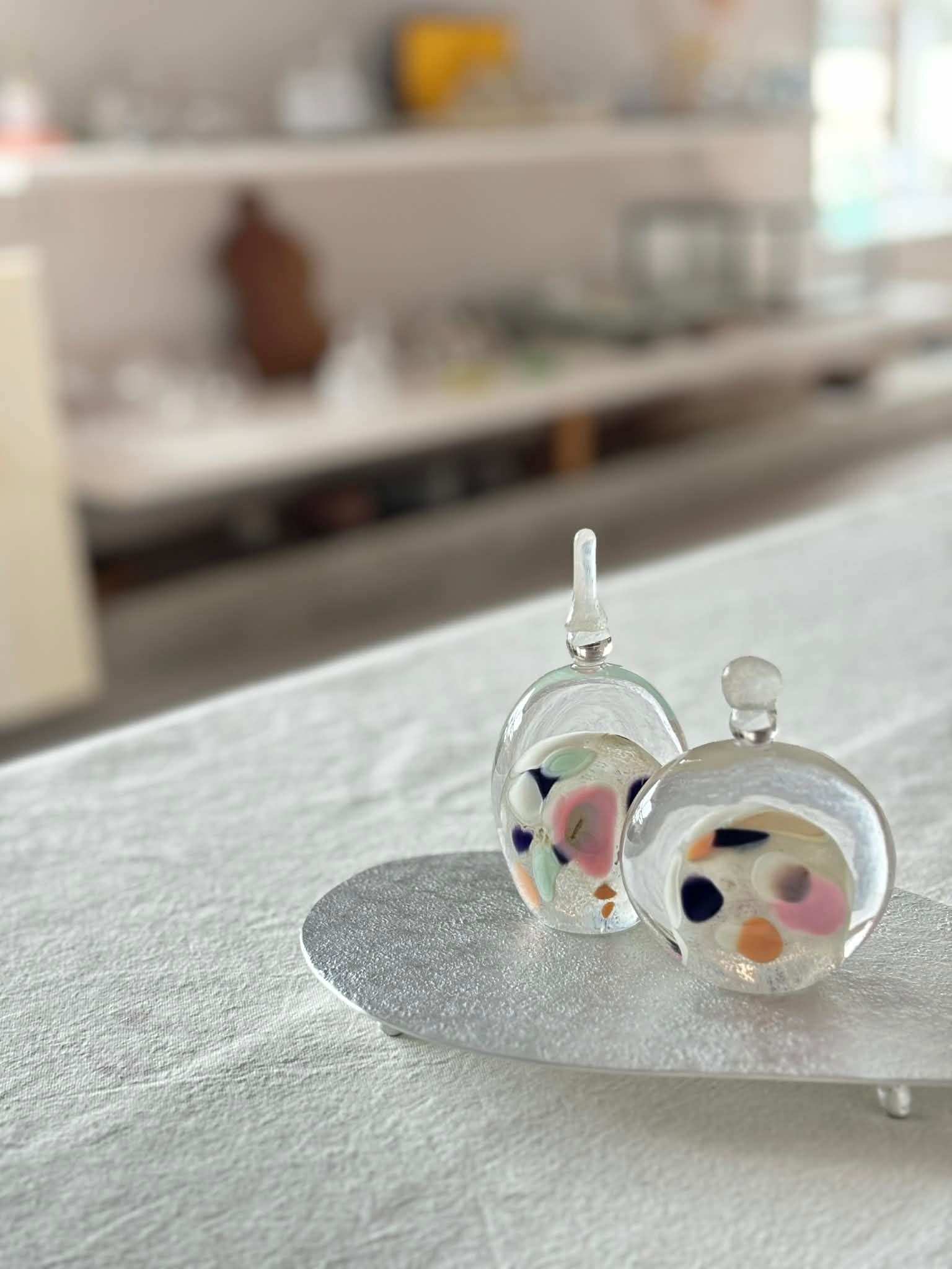 お雛様を香水瓶のような形に見立てて、すっきりとしたデザインにしています。
